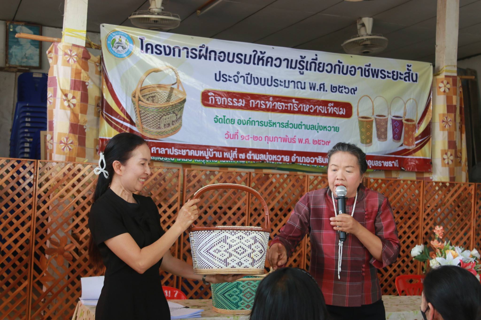 วันที่ 18 กุมภาพันธ์ 2569 เวลา 09.00 น. นายประเวส หอมชื่น ปลัดองค์การบริหารส่วนตำบลบุ่งหวาย รักษาราชการแทน นายกองค์การบริหารส่วนตำบลบุ่งหวายเป็นประธานเปิดงานโครงการฝึกอบรมให้ความรู้เกี่ยวกับอาชีพระยะสั้น กิจกรรมการทำตะกร้าหวายเทียม ณ ศาลาประชาคมหมู่ที่ 7 บ้านบุ่งหวายตก ตำบลบุ่งหวาย อำเภอวารินชำราบ จังหวัดอุบลราชธานี